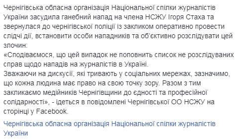 В Черниговской областной организации Национального союза журналистов Украины осудили нападение на члена НСЖУ Игоря Стаха и обратились к черниговской полиции с призывом оперативно провести следственные действия, установить личности нападавших и объективно расследовать это преступление.