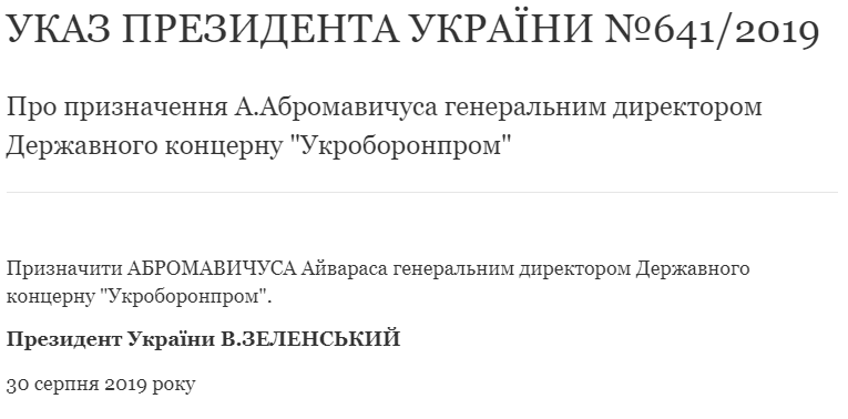 "Назначить Абромавичуса Айвараса генеральным директором Государственного концерна "Укроборонпром ", - говорится в тексте указа №641/2019г., обнародованном на сайте президента Украины в пятницу вечером.