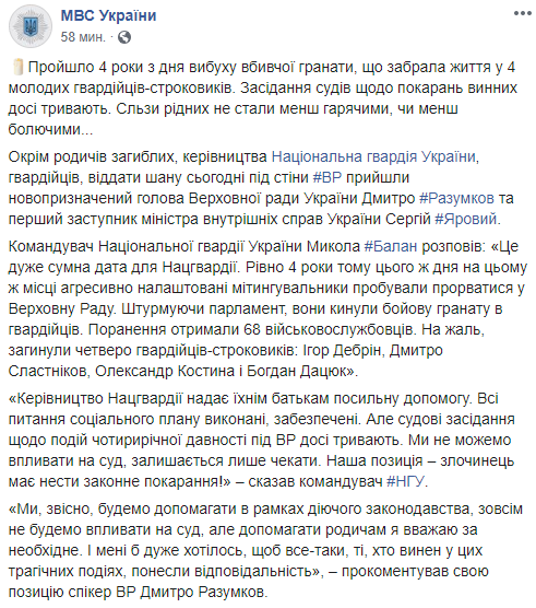 "Штурмуя парламент, они бросили боевую гранату в гвардейцев. Ранения получили 68 военнослужащих. К сожалению, погибли четверо гвардейцев-срочников: Игорь Дебрин, Дмитрий Сластников, Александр Костина и Богдан Дацюк", - отметил Балан.