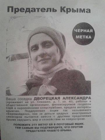 В феврале 2014 года в Крыму появились листовки с надписью "Предатель Крыма" с обвинениями проукраинских активистов в экстремизме, в том числе и Дворецкой. В листовке указывался ее домашний адрес и говорилось о том, что она работает в организации, спонсируемой Госдепом США.