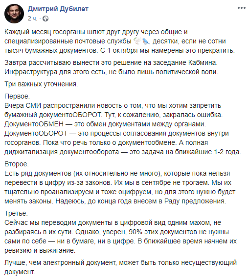 "Каждый месяц госорганы шлют друг другу через общие и специализированные почтовые службы десятки, если не сотни тысяч бумажных документов. С 1 октября мы намерены это прекратить... Пока что речь только о документообмене. А полная диджитализация документооборота - это задача на ближайшие 1-2 года", - говорится в сообщении.