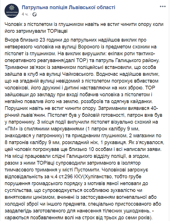 Задержанным оказался 40-летний львовянин. Его пистолет был в боевой готовности, патрон отправлен в патронник. Оружие оказалось со спиленной маркировкой и присоединенным глушителем. Также у задержанного изъяли 2 магазина по 8 патронов, раскладной нож и рукавицу.