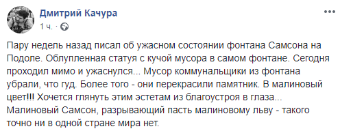 "Пару недель назад писал об ужасном состоянии фонтана Самсона на Подоле. Облупленная статуя с кучей мусора в самом фонтане. Сегодня проходил мимо и ужаснулся... Мусор коммунальщики из фонтана убрали, что гуд. Более того - они перекрасили памятник... Хочется глянуть этим эстетам из благоустроя в глаза", - написал Качура.