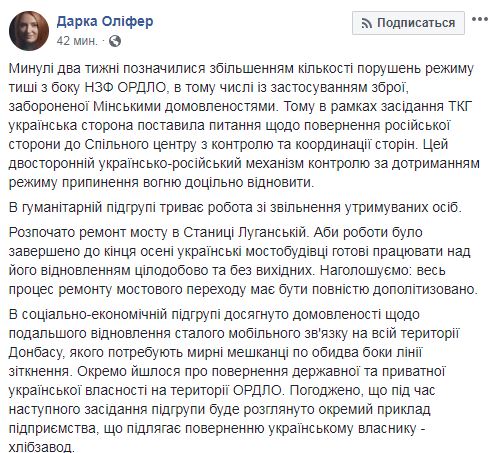 "Прошедшие две недели сказались увеличением количества нарушений режима тишины со стороны незаконных вооруженных формирований отдельных районов Донецкой и Луганской областей, в том числе – с применением оружия, запрещенного Минскими договоренностями. Поэтому в рамках заседания контактной группы украинская сторона поставила вопрос о возвращении российской стороны в СЦКК. Этот двусторонний российско-украинскую механизм контроля за соблюдением режима прекращения огня целесообразно восстановить", – заявила Олифер.