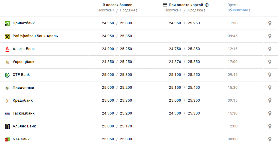 В обед покупка подешевела до 24,8-25 грн, а продажа не падает 25,15-25,45 грн. Например, в Приватбанке покупка 24,95 грн, продажа 25,30 грн. К вечеру ситуация не изменилась.