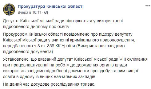 "Прокурором Киевской области сообщено о подозрении депутату Киевского городского совета в совершении уголовного преступления, предусмотренного ч. 3 ст. 358 Уголовного кодекса Украины (использование заведомо поддельного документа)", – рассказали в пресс-службе.