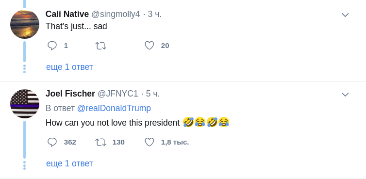 Подписчики Трампа неоднозначно отреагировали на пост президента. Одним видео показалось забавным, они писали "Ха-ха-ха, лучший президент" и "Как можно не любить этого президента", а другие осудили американского лидера за подобную публикацию и написали, что "Это грустно" и "Это что, действительно твит американского президента?"