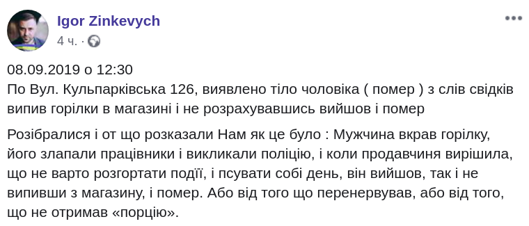 Во Львове мужчина украл водку из магазина и умер, как только вышел из помещения с бутылкой. Об этом на своей странице в социальной сети Facebook сообщил депутат Львовского горсовета Игорь Зинкевич.