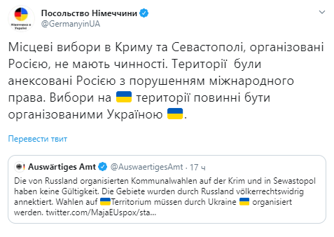 Германия не признает выборы, проведенные Россией в аннексированном Крыму. Об этом посольство ФРГ в Украине сообщило в своем микроблоге в Twitter.