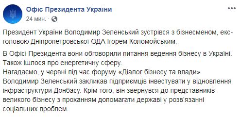 Президент Украины Владимир Зеленский встретился с бизнесменом, экс-председателем Днепропетровской ОГА Игорем Коломойским.