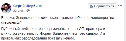 "В офисе Зеленского, похоже, окончательно победила концепция "не стесняемся". Публичный отчет о встрече президента, главы ОП, премьера и министра энергетики с Игорем Валериевичем - это сильно. И в программах расследований показать нечего", - написал журналист Сергей Щербина в Facebook.