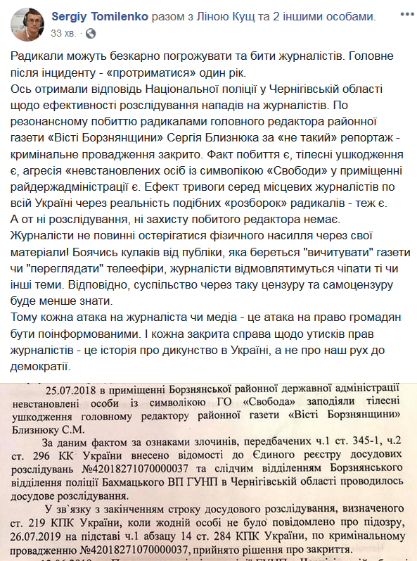 Вот получили ответ Национальной полиции в Черниговской области по эффективности расследования нападений на журналистов. По резонансному избиению радикалами главного редактора районной газеты "Вести Борзнянщины" Сергея Близнюка за "не такой" репортаж - уголовное производство закрыто.