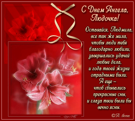 Милая Людмила! С днем ангела, пусть дни будут солнечными, а небо - голубым, верных подруг и друзей, пусть в доме будут достаток, уют и тепло.