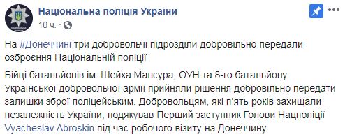 "Бойцы батальонов им. Шейха Мансура, ОУН и 8-го батальона Украинской добровольческой армии приняли решение добровольно передать оставшееся оружие полицейским", - говорится в сообщении.