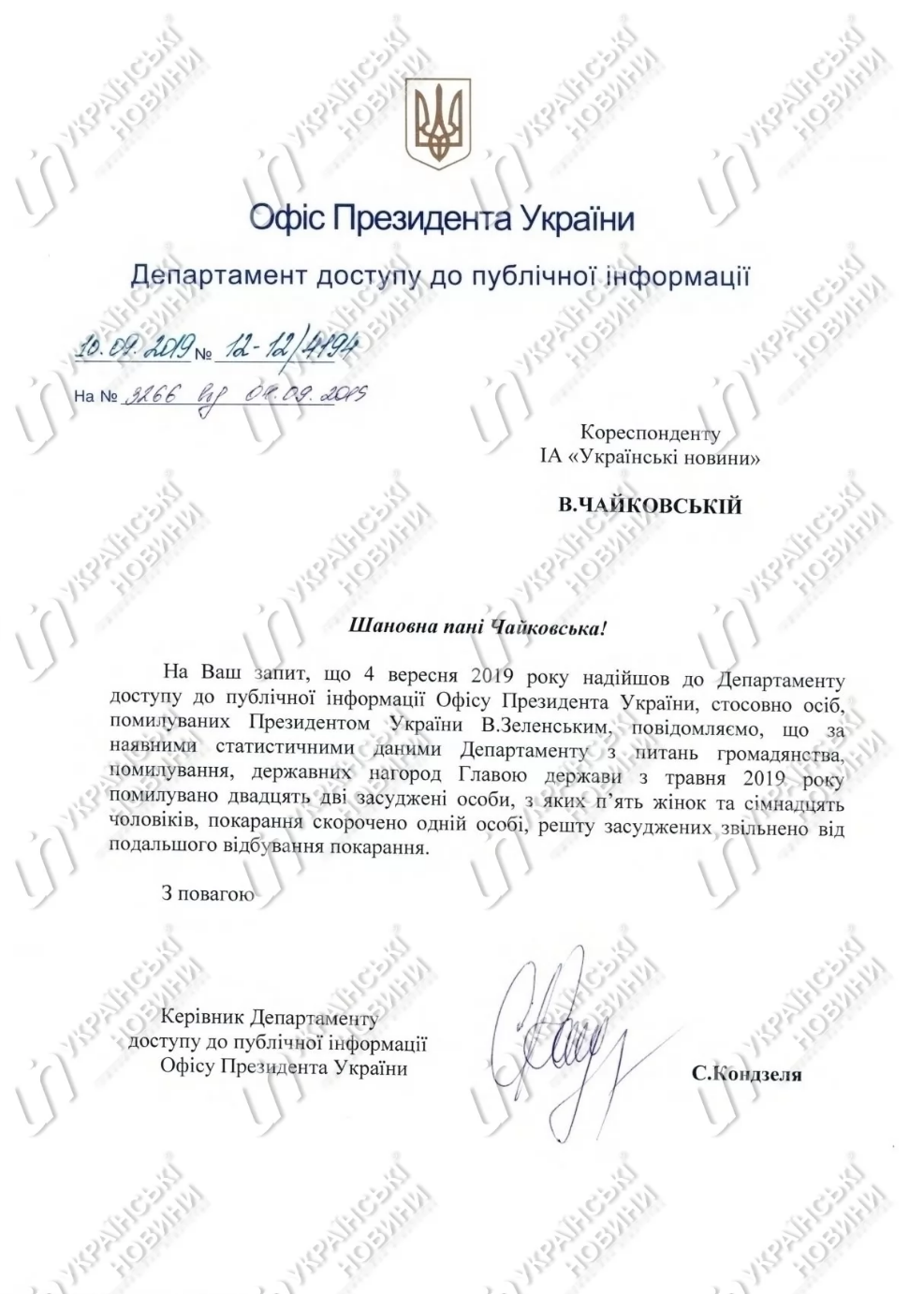 Как видно из скана ответа Офиса, Зеленский помиловал 22 осужденных лица, из которых 5 женщин и 17 мужчин. Наказание одному лицу сокращено, остальных осужденных освободили от дальнейшего наказания.