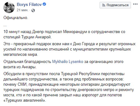 Официально мэр города рассказал, что Днепр подписал Меморандум о сотрудничестве со столицей Турции Анкарой. Также Борис Филатов добавил, что в присутствии посла Турецкой Республики обсуждались перспективы дальнейшего сотрудничества, а также ряд проблемных вопросов.