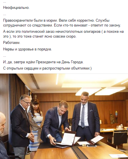 "Неофициально. Правоохранители были в мэрии. Вели себя корректно. Службы сотрудничают со следствием. Если кто-то виноват - ответит по закону. А если это политический заказ нечистоплотных олигархов (а похоже на это), то это тоже станет ясно совсем скоро. Работаем. Нервы и здоровье в порядке... И, да, завтра ждём президента на День города. С открытым сердцем и распростертыми объятиями", - написал Борис Филатов.