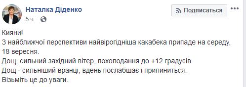 В Киев в среду, 18 сентября, придет резкое похолодание с падением температуры до +12 градусов. Об этом на своей странице в Facebook написала синоптик Наталка Диденко.