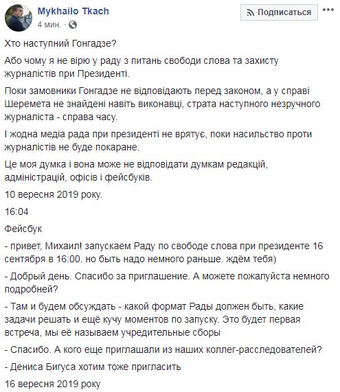 Вокруг новосозданного Совета по свободе слова при Офисе президента разгорелся очередной скандал. Журналист "Схем" Михаил Ткач заявил, что его включили в состав Совета без его личного участия в подготовительном заседании, а о самом факте своего членства в Совете он узнал постфактум. Об этом Ткач заявил в Facebook.