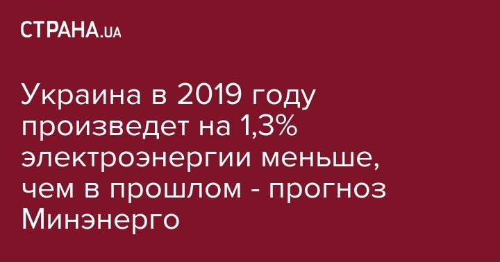 Министерство энергетики и окружающей среды прогнозирует, что Украина по итогам 2019 года произведет на 1,3% меньше электрической энергии, чем в прошлом году. Об этом сообщает "Интерфакс-Украина".