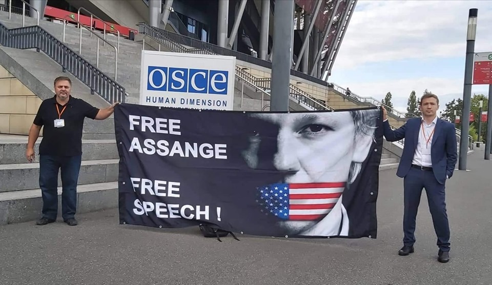 Журналисты Василец и Коцаба устроили флешмоб за свободу Ассанжа на конференции ОБСЕ. Фото