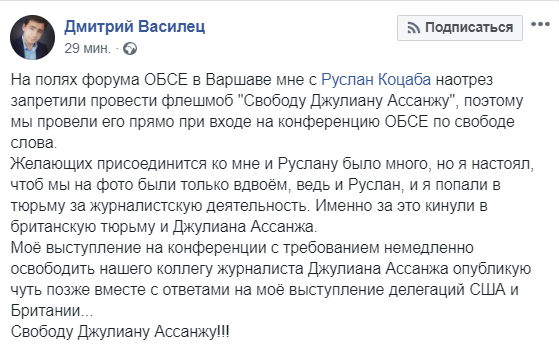"На полях форума ОБСЕ в Варшаве мне с Руслан Коцаба наотрез запретили провести флешмоб "Свободу Джулиану Ассанжу", поэтому мы провели его прямо при входе на конференцию ОБСЕ по свободе слова. Желающих присоединится ко мне и Руслану было много, но я настоял, чтоб мы на фото были только вдвоём, ведь и Руслан, и я попали в тюрьму за журналистскую деятельность. Именно за это кинули в британскую тюрьму и Джулиана Ассанжа", - написал Василец.