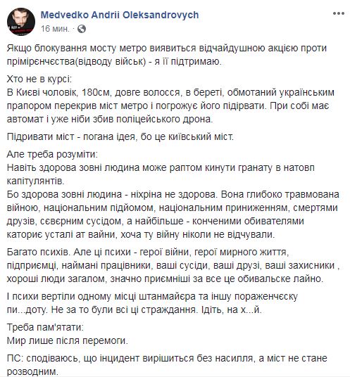 "Если блокировка моста Метро окажется отчаянной акцией против примиренчества (отвода войск) - я ее поддержу", - написал он. Он считает ,что "подорвать мост - плохая идея", но "мир - лишь после победы".