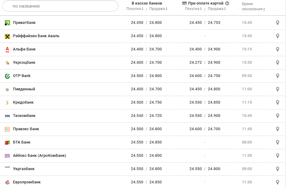 В банках курс доллара с утра был такой: покупка от 24,50 до 24,72 грн и продажа от 24,67 до 25,10 грн. В обед доллар покупают от 24,40 до 24,65 грн и продают от 24,62 до 25,10 грн. Вечером доллар покупают от 24,30 до 24,65 грн и продают от 24,56 до 25,10 грн.