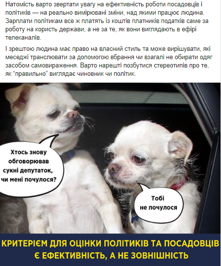 "Зато стоит обращать внимание на эффективность работы чиновников и политиков - на реально измеряемые изменения, над которыми работает человек. Зарплаты политикам все же платят из средств налогоплательщиков именно за работу в пользу государства, а не за то, как они выглядят в эфире телеканалов. Наконец человек имеет право на собственный стиль и может решать, какие месседжи транслировать с помощью одежды или вообще не выбирать одежду средством самовыражения. Стоит наконец избавиться от стереотипов о том, как "правильно" выглядит чиновник или политик", - подытожила Супрун.