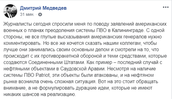 В качестве примера Медведев привел атаку беспилотников, приведшую к разрушению нефтяных объектов в Саудовской Аравии, которые защищали американские системы Patriot. "Вот на это стоит обращать внимание, а не формулировать дурацкие идеи, которые не имеют никаких шансов на реализацию", — добавил премьер.