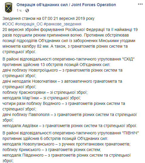 За прошедшие сутки, 20 сентября на Донбассе боевики 19 раз нарушали режим прекращения огня, в результате чего были ранены четыре бойца ВСУ. Об этом в Facebook сообщает пресс-центр ООС.