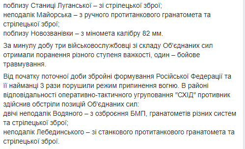 "За минувшие сутки трое военнослужащих из состава Объединенных сил получили ранения различной степени тяжести, один - боевое травмирования", - сказано в сообщении.