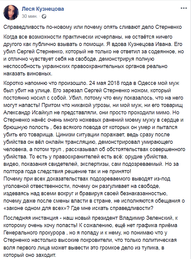 "Последняя инстанция - наш новый президент Владимир Зеленский, к которому очень хочу попасть! К сожалению, еще нет графика приема генерального прокурора, но я попаду и к нему. Но понимаю, что у Стерненко настолько высокие покровители, что только политическая воля первого лица может вывести это громкое дело из тупика, в который оно заходит", - резюмировала Леся Кузнеуова.