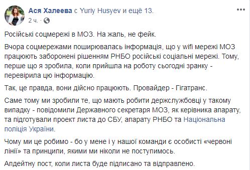"Российские соцсети в Минздраве. К сожалению, не фейк. Вчера по соцсетям ходила информация, что в wifi сети Минздрава работают запрещены решением СНБО российские социальные сети. Поэтому, первое что я сделала, когда пришла на работу сегодня с утра - проверила эту информацию. Да, это правда, они действительно работают. Провайдер - Гигатранс", - написала Халеева.