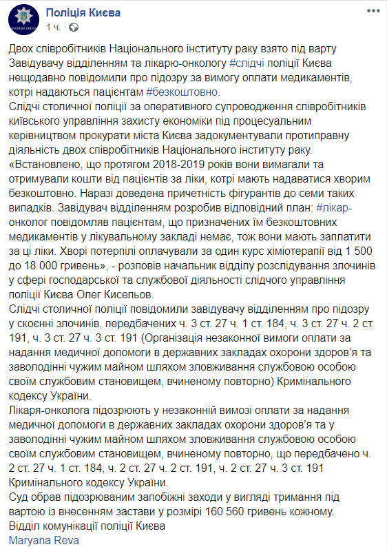 Следователи столичной полиции сообщили заведующему отделением о подозрении в совершении преступлений, предусмотренных ч. 3 ст. 27 ч. 1 ст. 184, ч. 3 ст. 27 ч. 2 ст. 191, ч. 3 ст. 27 ч. 3 ст. 191 (Организация незаконного требования оплаты за предоставление медицинской помощи в государственных учреждениях здравоохранения и завладении чужим имуществом путем злоупотребления должностным лицом своим служебным положением, совершенном повторно) Уголовного кодекса Украины.