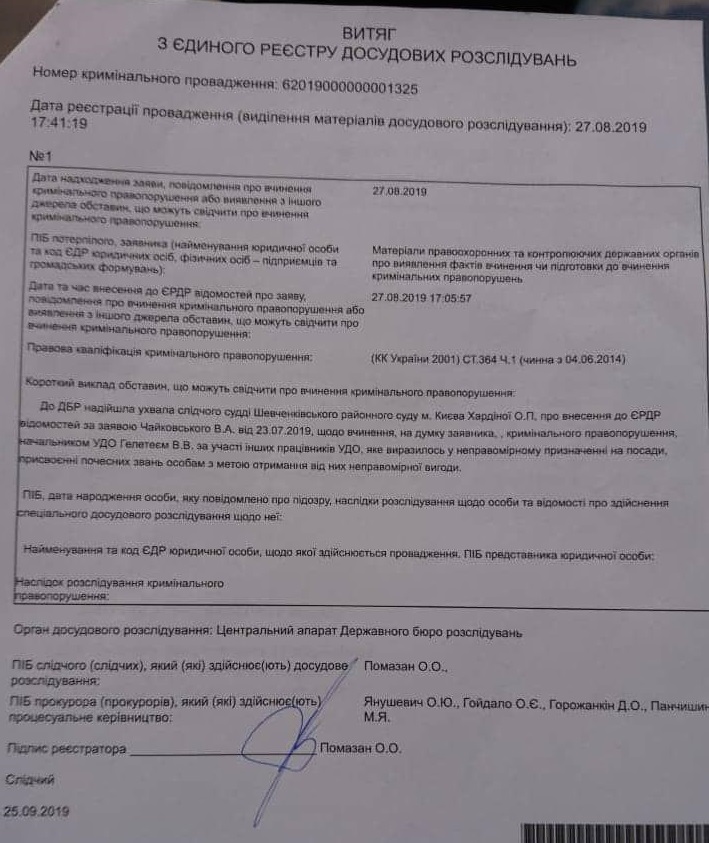"В ГБР поступило постановление следственного судьи Шевченковского районного суда г. Киева Хардиной О.П. о внесении в ЕДРДР сведений по заявлению Чайковского В. А. от 23.07.2019 касательно совершения, по мнению заявителя, уголовного преступления начальником УГО Гелетеем В.В. с участием других работников УГО, которое заключалось в неправомерном назначении на должности и присвоении почетных званий лицам с целью получения от них неправомерной выгоды", - сказано в документе.