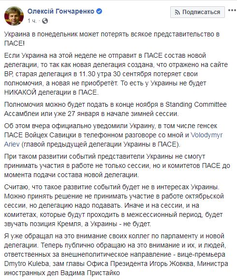 На своей странице в Facebook Гончаренко также написал, что "если Украина на этой неделе не отправит в ПАСЕ состав новой делегации, то, поскольку новая делегация создана, что отражено на сайте ВР, старая делегация в 11:30 утра 30 сентября утратит свои полномочия, а новая не приобретет. То есть у Украины не будет никакой делегации в ПАСЕ".