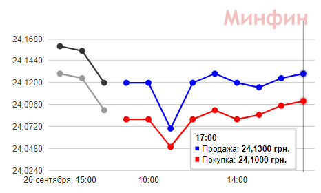 В обменках по состоянию на 08:00 средняя покупка  24,09 грн, средняя продажа - 24,14 грн.