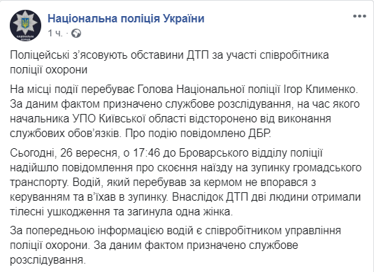 Согласно предварительным данным, водитель - сотрудник управления полиции охраны. По данному факту назначено служебное расследование, на время которого начальник управления полиции охраны Киевской области отстранен от исполнения служебных обязанностей. О происшествии сообщено в Государственное бюро расследований (ГБР).
