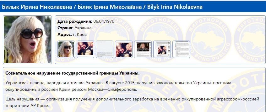 "Сознательное нарушение государственной границы Украины. Украинская певица, народная артистка Украины. В августе 2015, нарушив законодательство Украины, посетила ккупированный россией Крым рейсом Москва—Симферополь. Цель нарушения — организация получения дополнительного заработка на временно оккупированной агрессором-россией территории АР Крым".