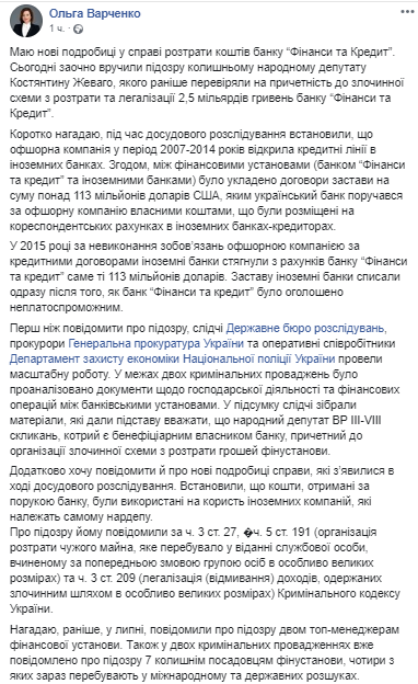 Госбюро расследований заочно вручило подозрение экс-нардепу Константину Жеваго, которого ранее проверяли на предмет причастности к схеме с растратой и легализацией 2,5 миллиардов гривен банка "Финансы и Кредит". Об этом на своей странице в соцсети сообщила первый заместитель председателя ГБР Ольга Варченко.