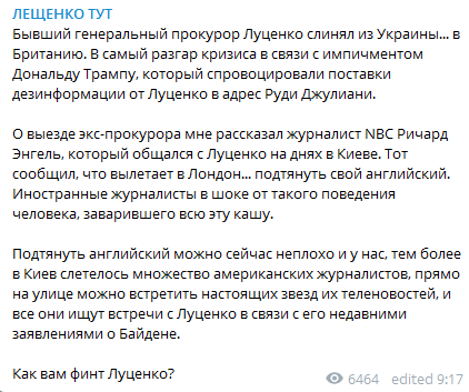 "Подтянуть английский можно сейчас неплохо и у нас, тем более в Киев слетелось множество американских журналистов, прямо на улице можно встретить настоящих звезд их теленовостей, и все они ищут встречи с Луценко в связи с его недавними заявлениями о Байдене", - написал Сергей Лещенко.