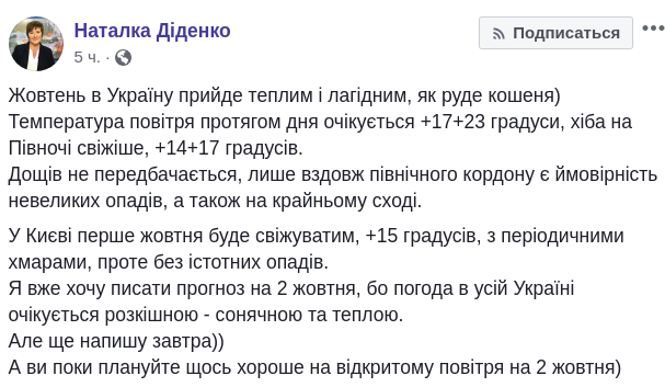Синоптик Наталья Диденко написала, что первый день октября в Украине будет теплым и ласковым, как рыжий котенок и дала прогноз погоды на вторник, 1 октября, на своей странице в Facebook.