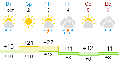На этой неделе синоптики пообещали потепление, но всего на два дня. Солнце прогреет воздух до +22 днем 2 и 3 октября, а затем опять похолодает до +12 и зарядят дожди. Об этом говорят прогнозы погоды на неделю от разных источников.