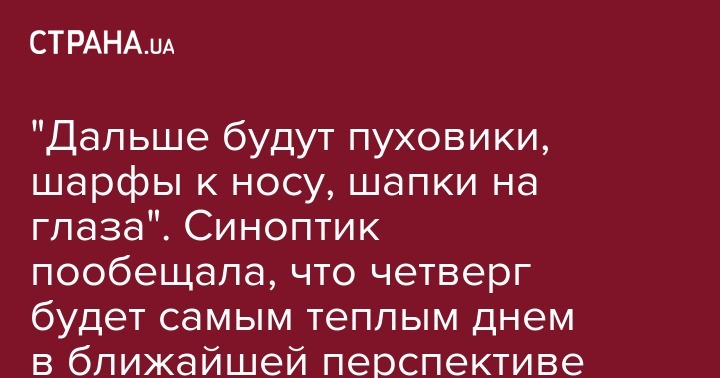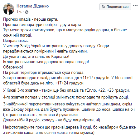 "В ближайшей перспективе четверг будет самым теплым днем, кроме запада Украины, дальше будут пуховики, шарфы к носу, шапки на глаза и, страшно сказать, возможно, и перчатки. Дождям будто и радуюсь, холоду - не буду лицемерить -  нет. Нафотографуйте пока красивые деревья и кусты, потому что вскоре будет уже из листочков каша, а не осенняя желтая теплая музыка", - написала Диденко.