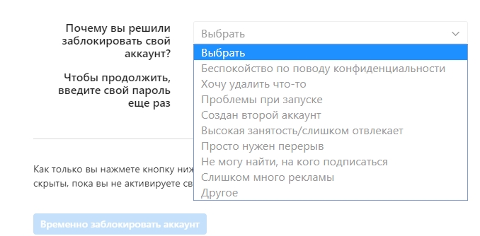 После этого нужно будет обязательно выбрать причину блокировки из выпадающего списка, а также ввести пароль, чтобы подтвердить свой выбор. После этого ваша страница Instagram будет скрыта от всех пользователей.