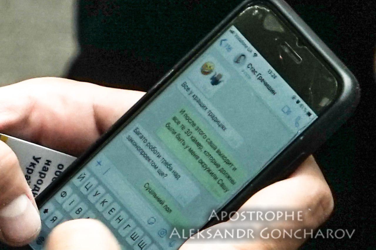 Как сообщается, во время голосования народный депутат Дмитрий Гурин вел переписку со Станиславом Гречишиным об Александре Ткаченко - авторе законопроекта. Все они из фракции "Слуга народа". Корреспондент издания запечатлел на фото данную переписку.