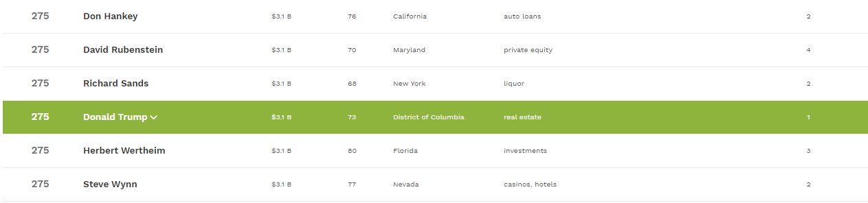 Стоит отметить, что Дональд Трамп делит отведенное ему 275 место с еще одиннадцатью миллиардерами, состояние которых оценивается также в $3,1 млрд.