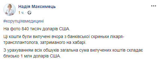 "На фото - 840 тысяч долларов США. Эти средства изъяты вчера из банковской ячейки врача-трансплантолога, задержанного на взятке. С учетом всех обысков общая сумма изъятых средств составляет около 1 млн долларов США", - написала Максимец в Facebook.