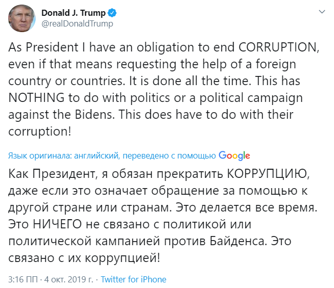 "Как Президент я обязан прекратить коррупцию, даже если это означает обращение за помощью к другой стране или странам. Это делается все время. Это никак не связано с политикой или политической кампанией против Байдена. Это связано с их коррупцией!" - говорится в сообщении Трампа.